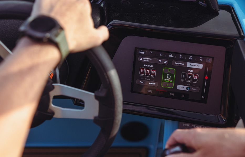 The NXT Family features a new dash with a 7-inch touchscreen display, integrated surf wave graphics, updated SurfStar software and new foil profiles along with music controls, eliminating the need for separate radio controls. The helm includes a standard wireless phone charger, with the option to add 4 wireless chargers in the cockpit.