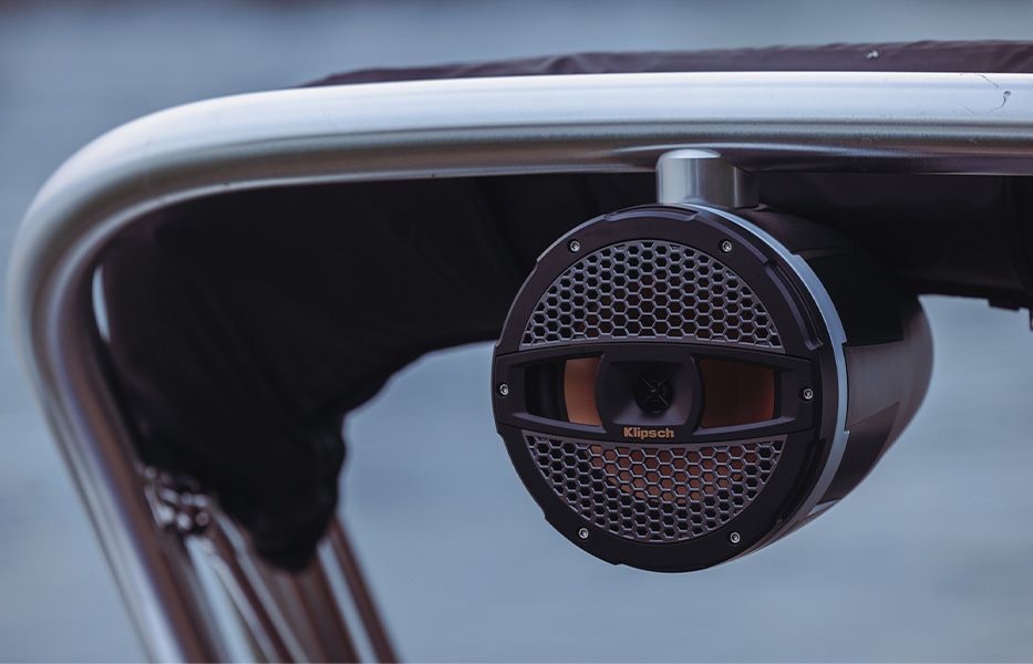 Enhance your audio experience with the powerful M80 speaker cans with double the output. These sleek black tower speakers with silver accents feature Klipsch audio enhancements and deliver crystal-clear tunes. Enjoy an immersive audio experience as an available option on all 2024 MasterCraft models.